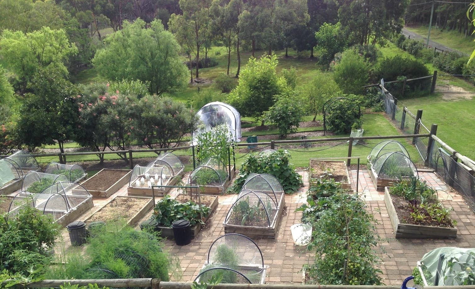 Kentridge Gardens has been developed over 25 years. It started as mostly bare horse paddocks on 5 acres and is now a large garden with 44 raised vegetable beds, including some wicking beds. There is an orchard with more than 90 fruit trees. Other plants include flowering natives and trees, lots of camellias and more than 200 roses and 500 metres of hedging. There are also areas of bush tucker plants. Drip irrigation and venturi fertilisation systems are in use throughout the garden.