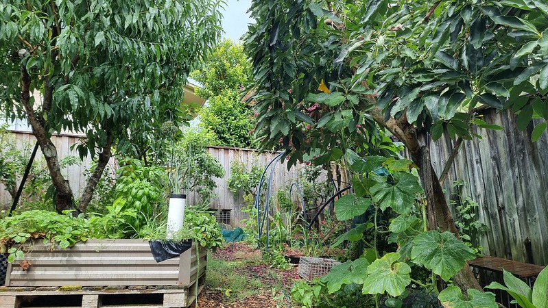 With over fourteen fruit trees, assorted wicking beds, worm farms and composts, water collection, a native beehive, and chickens, the garden provides a broad variety of edibles for the household. These include eggs, leafy greens, and herbs all year around, and additional fresh fruit and annual vegetables through the spring and summer (and into the autumn and winter with preserving techniques).